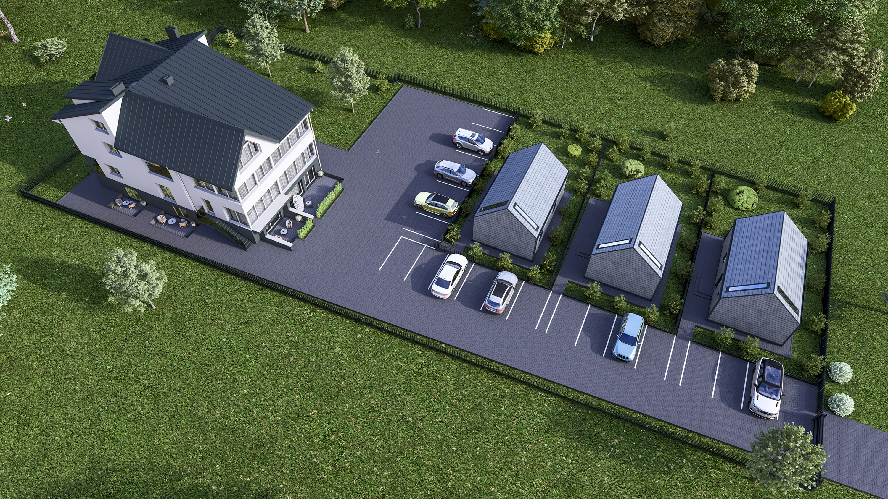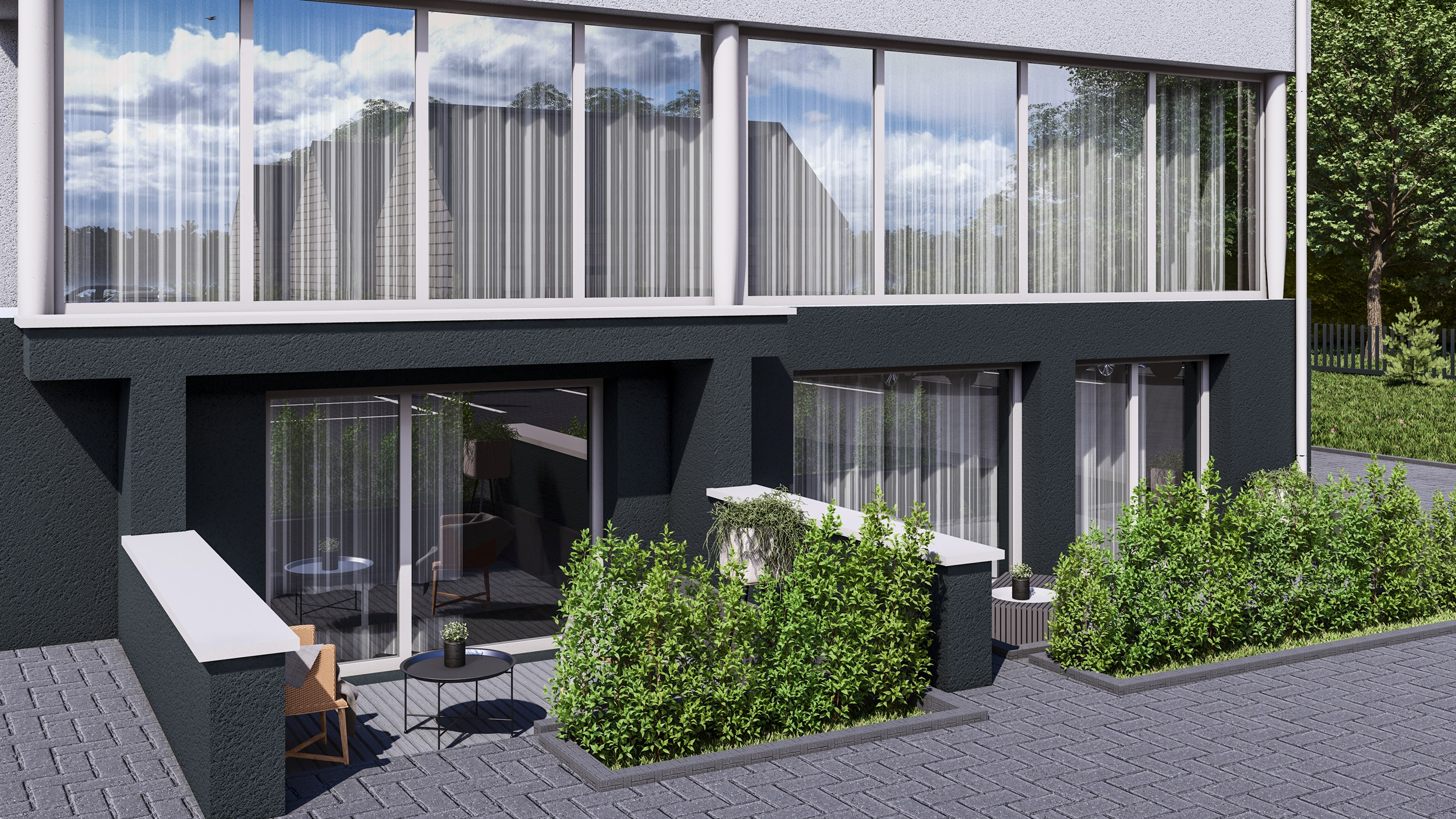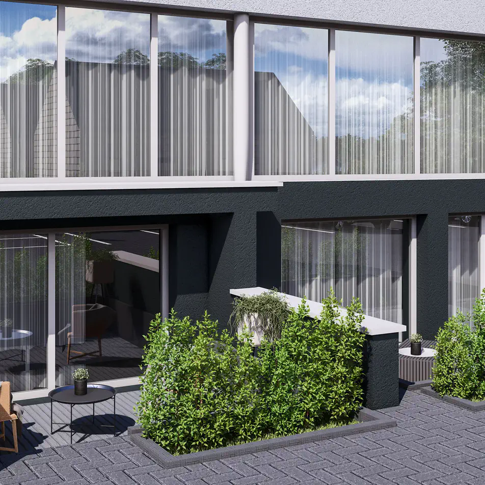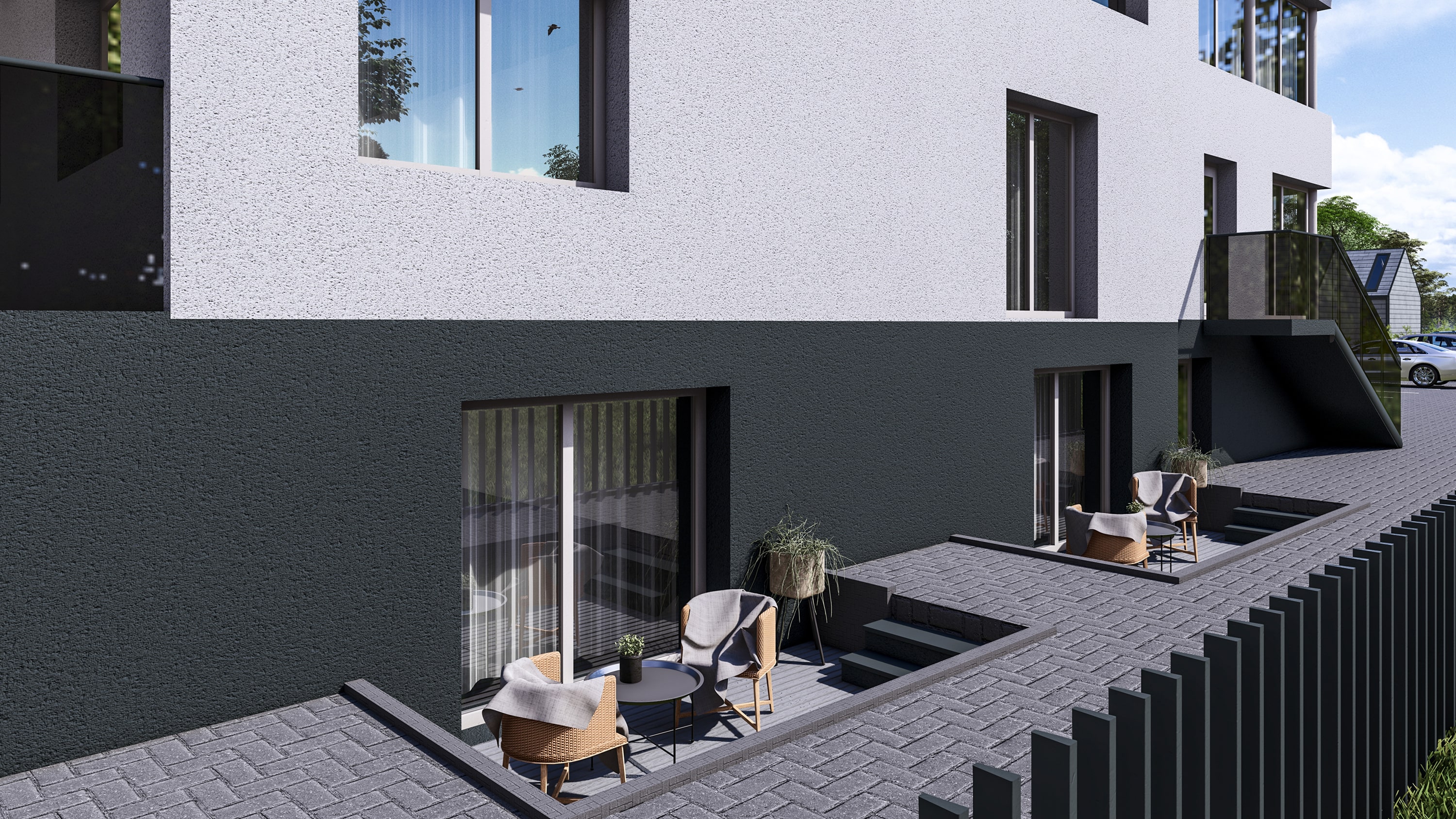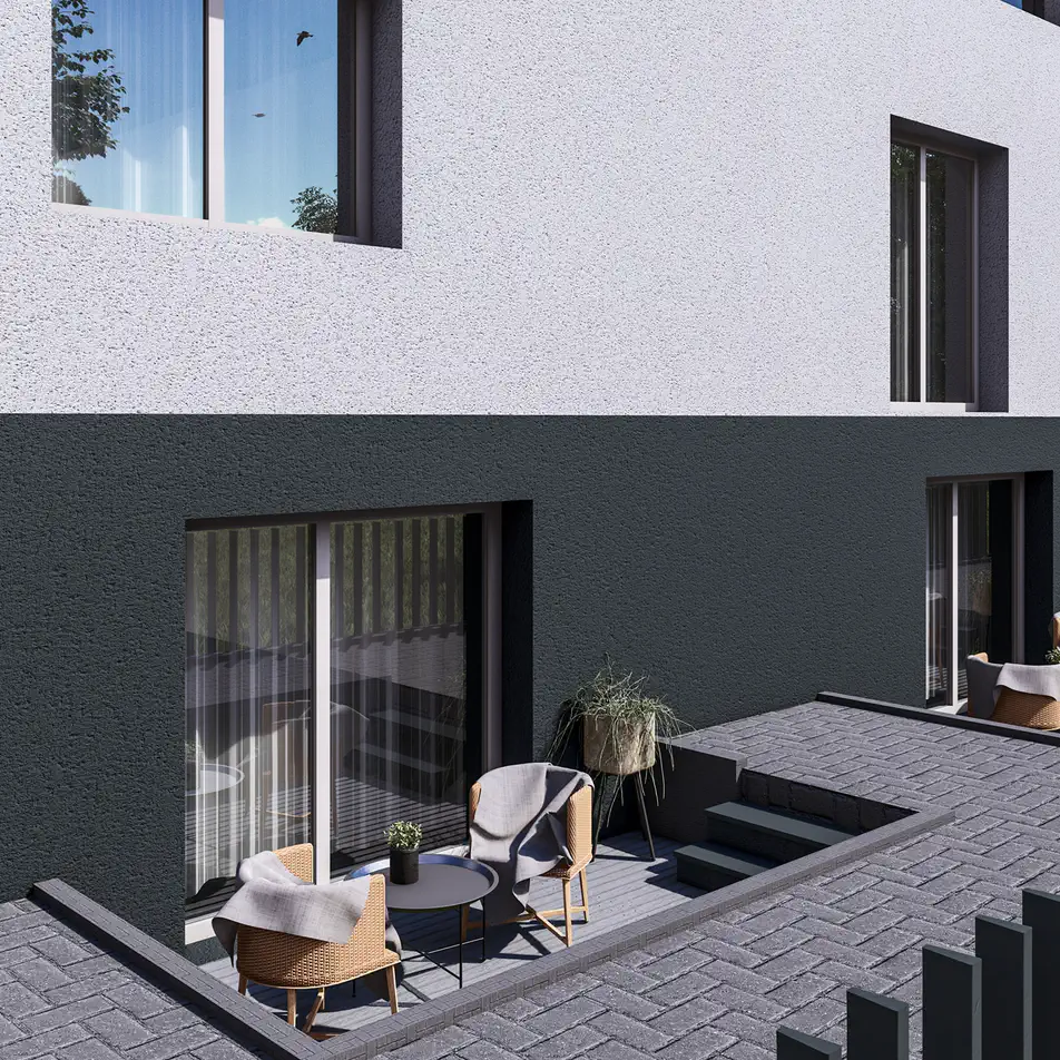 Dalies būstų gyventojai galės mėgautis lauko terasomis. Likusi kiemo zona – bendro naudojimo, skirta pasisėdėjimams ir kaimynų bendravimui gryname ore.